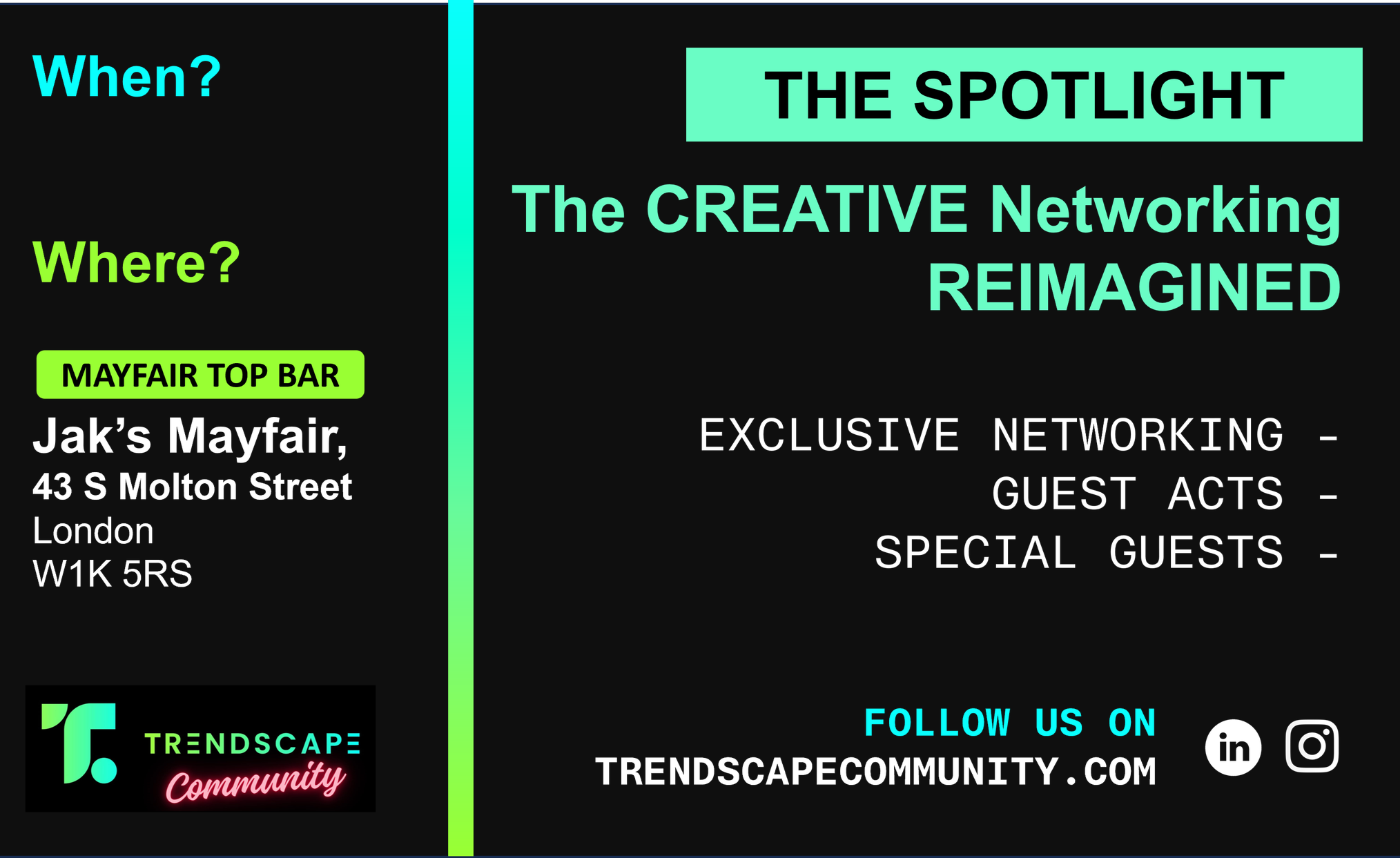 Trendscape is a new fast-growing community of London’s creative visionaries. Built in 2023, with already over 900 members, Trendscape is the epicenter where creativity meets business and fun.Imagine an event where music isn't just background noise—it’s the heartbeat of the room. Trendscape Events gather extraordinary individuals, including celebrities and relevant figures, for an exclusive experience.Trendscape events gather 100+ remarkable guests together spanning the realms of dance, music, film, production, fashion and the creative arts!